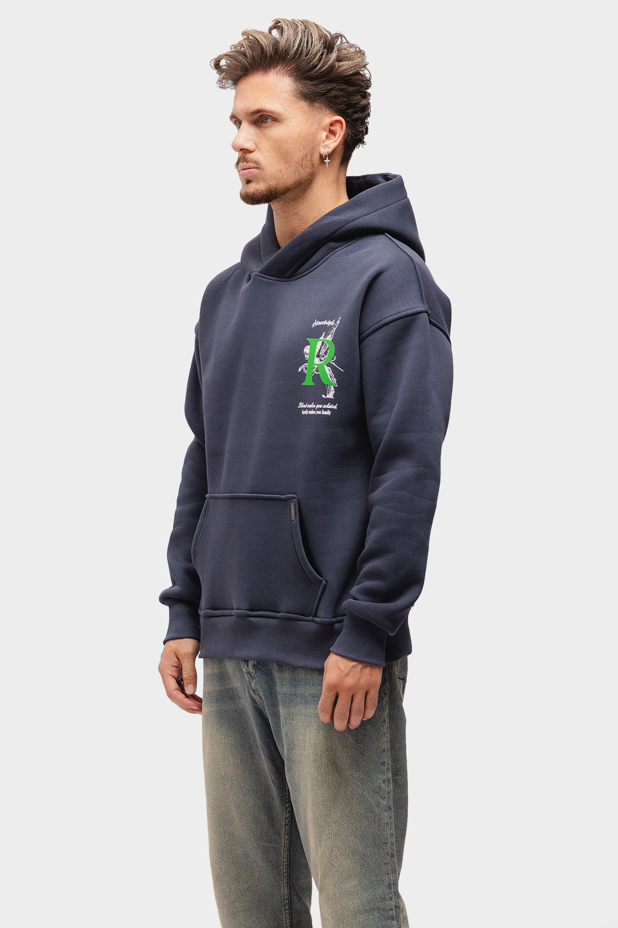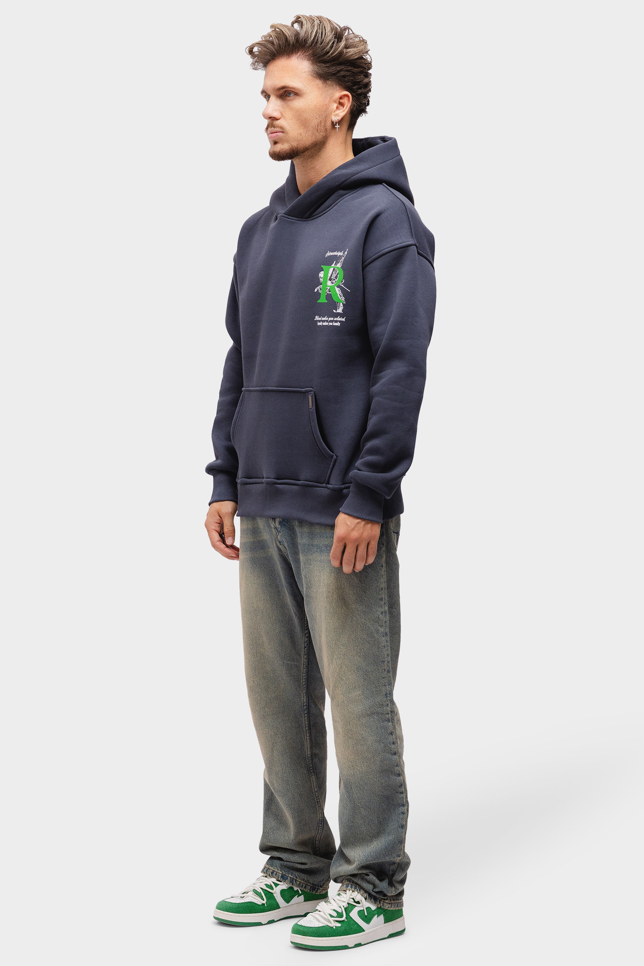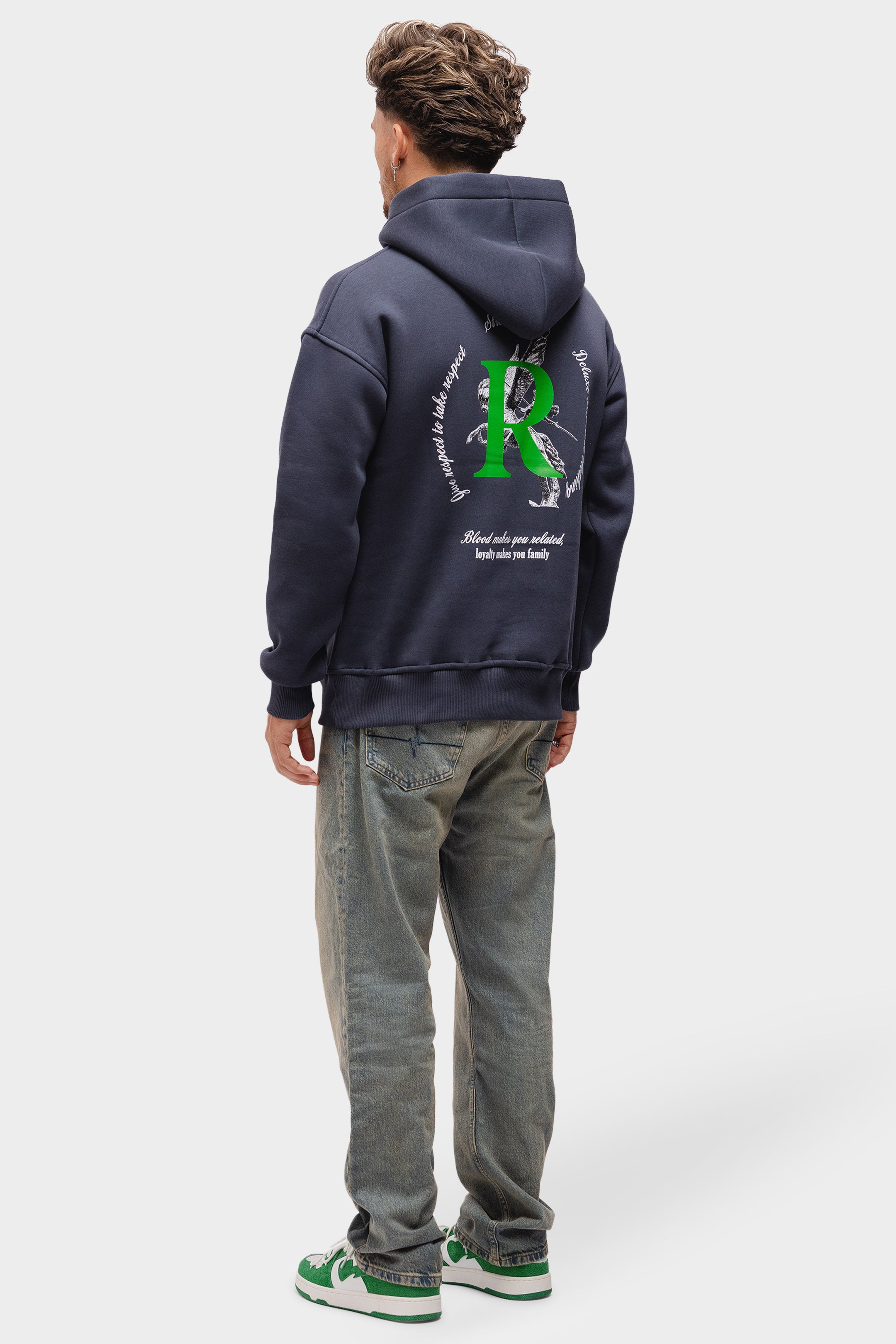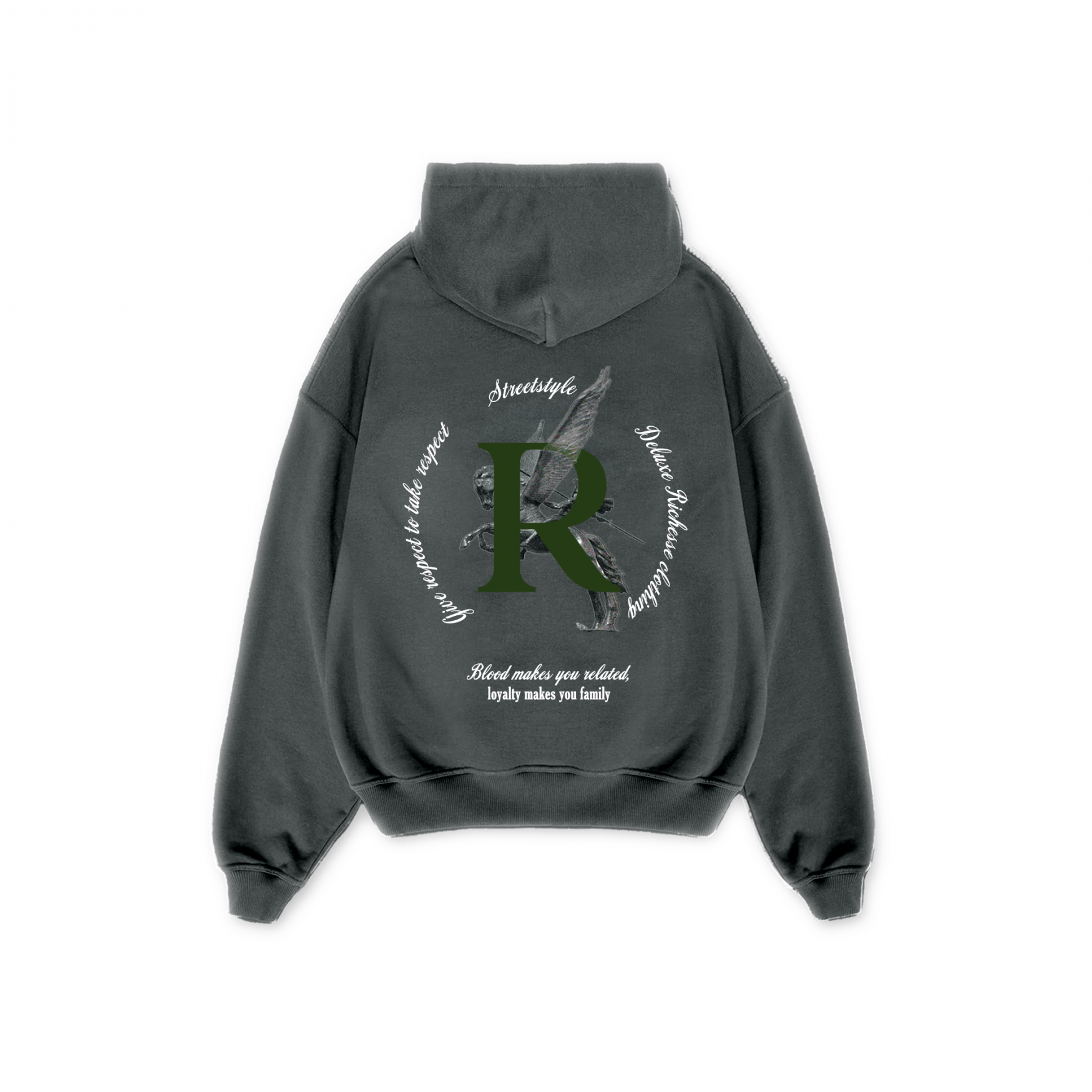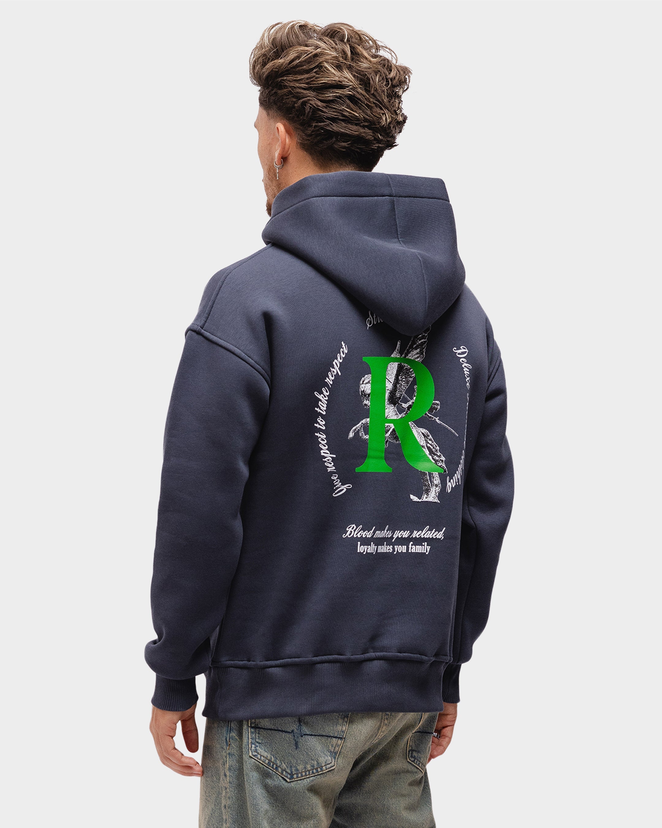 Unser Artemis-Hoodie besteht aus robuster Bio-Baumwolle. Der Hoodie hat eine geräumige Kapuze. Unser wiederkehrendes Richesse-Logo erscheint auf der Vorderseite. Auf der Rückseite finden Sie den charakteristischen Text „Blut macht Sie verwandt, Loyalität macht Sie zur Familie“.