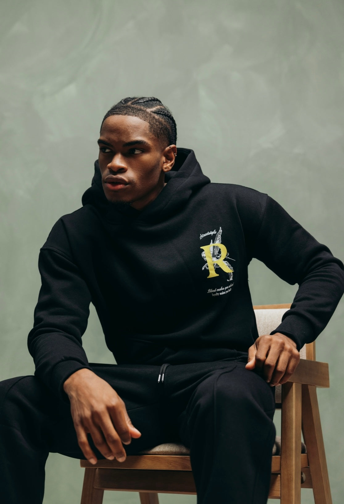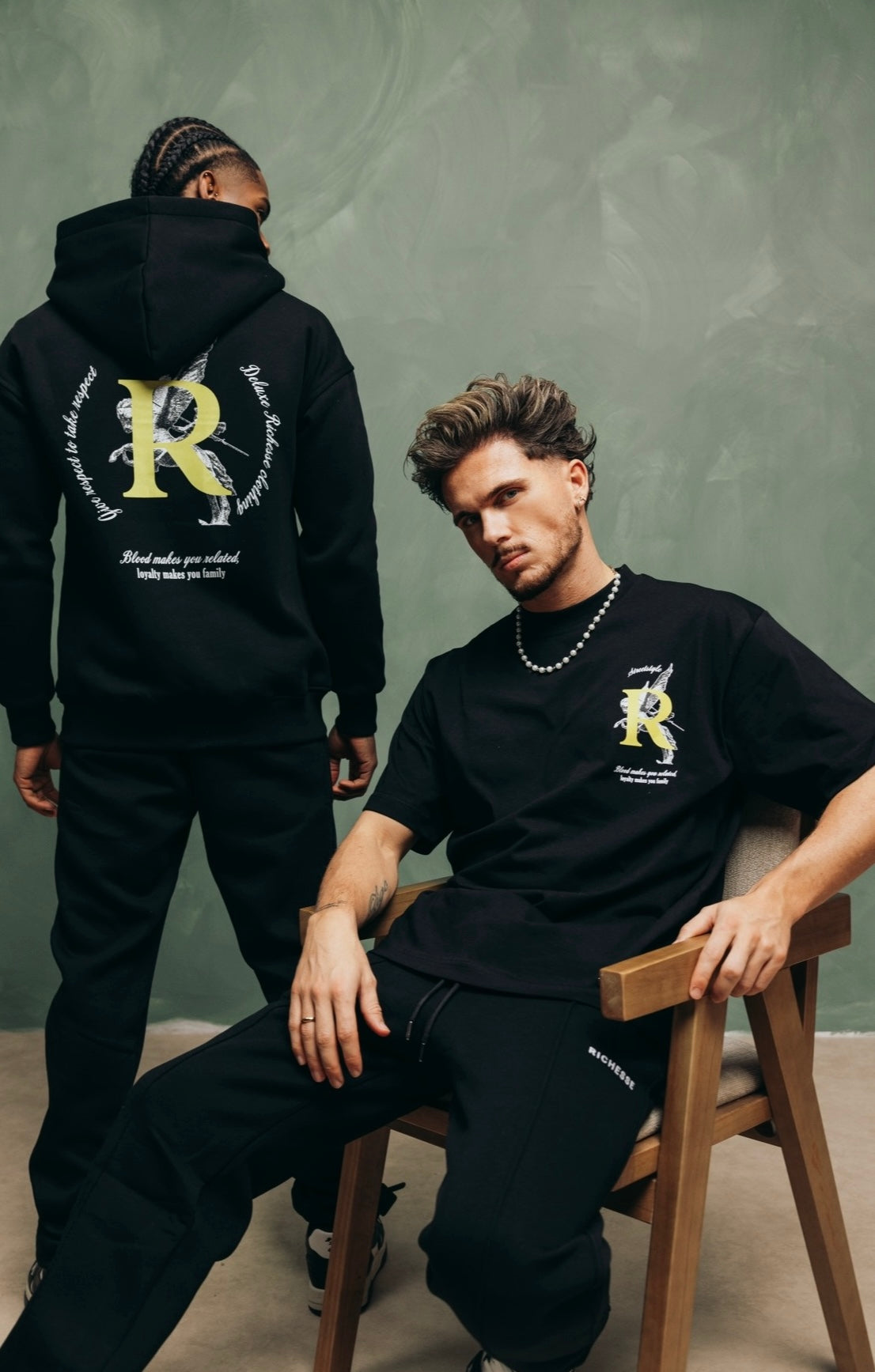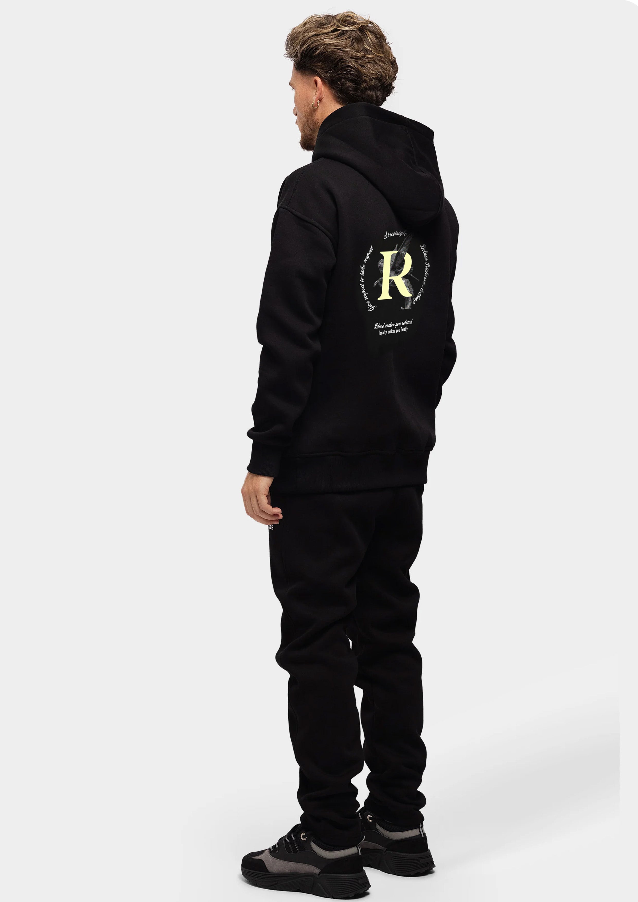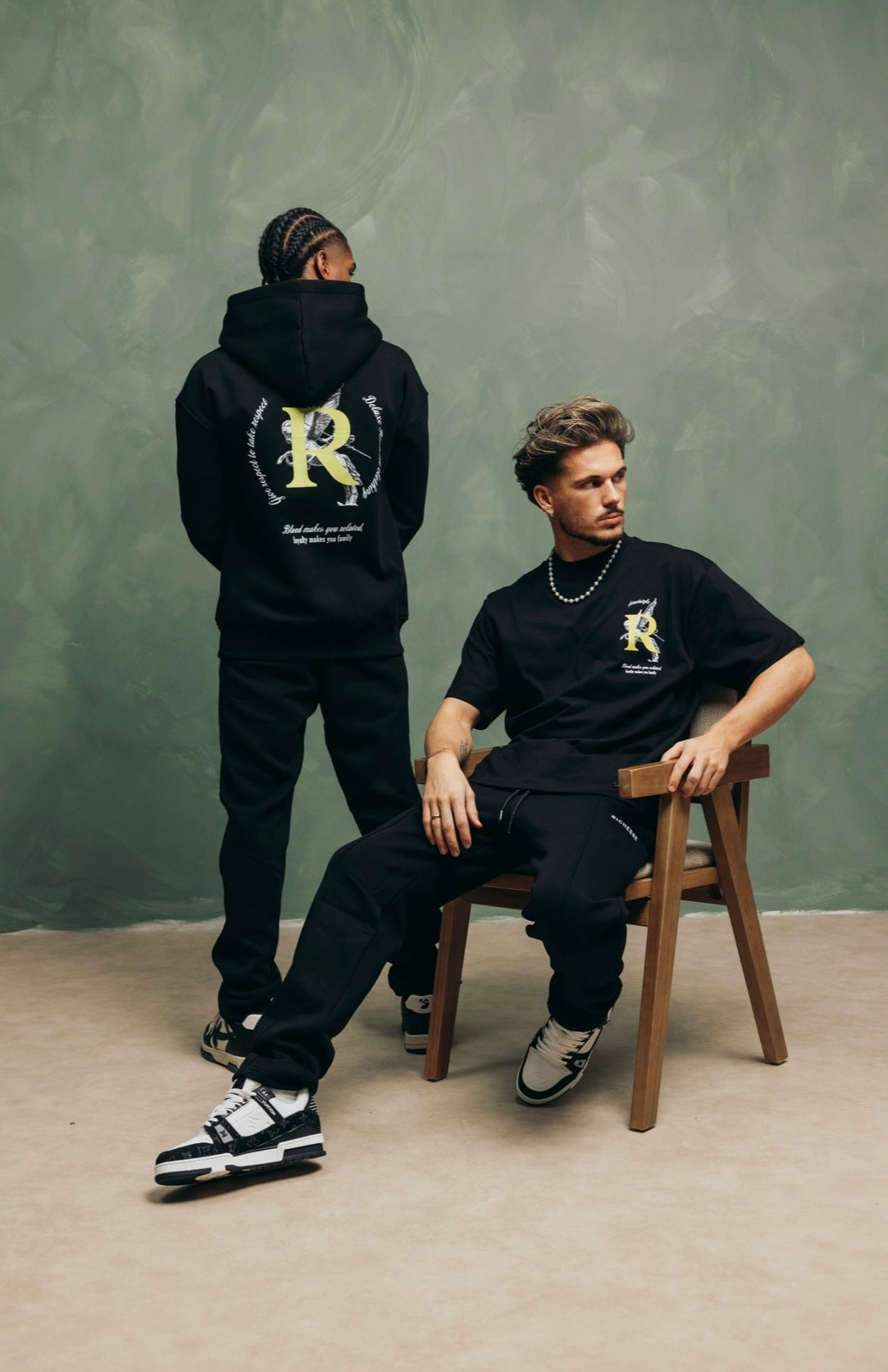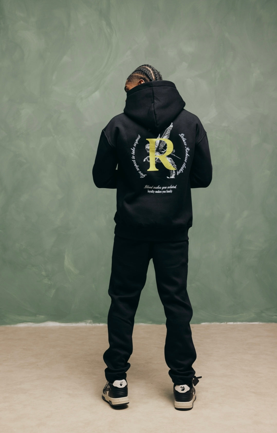 Our Artemis hoodie is made of sturdy Organic Cotton. The hoodie has a spacious hood. Our returning Richesse logo appears on the front. On the back you will find the characteristic text "Blood Makes You Related, Loyalty Makes you family". The pants are slightly oversized with a flair at the bottom. There is a hidden zipper in the trouser leg so you can add flair.