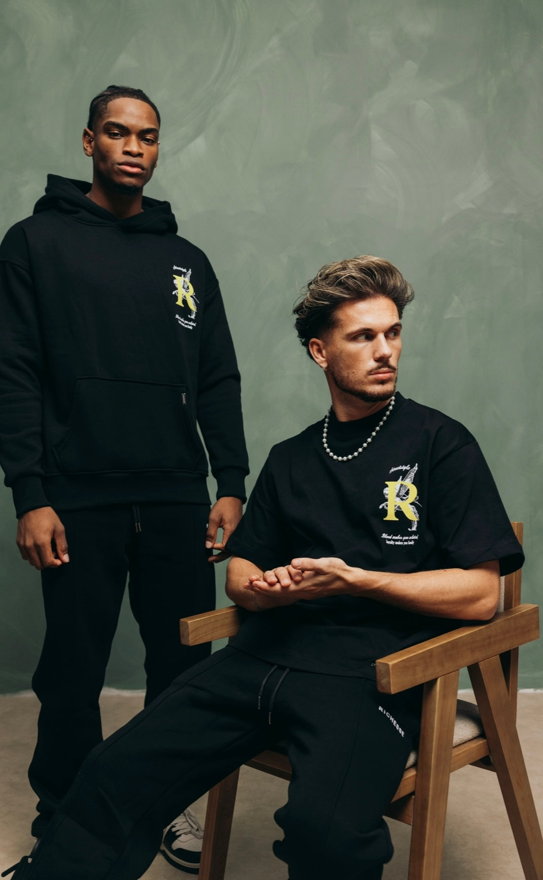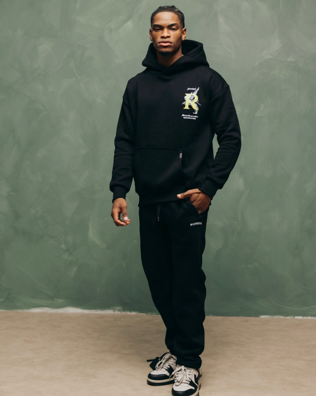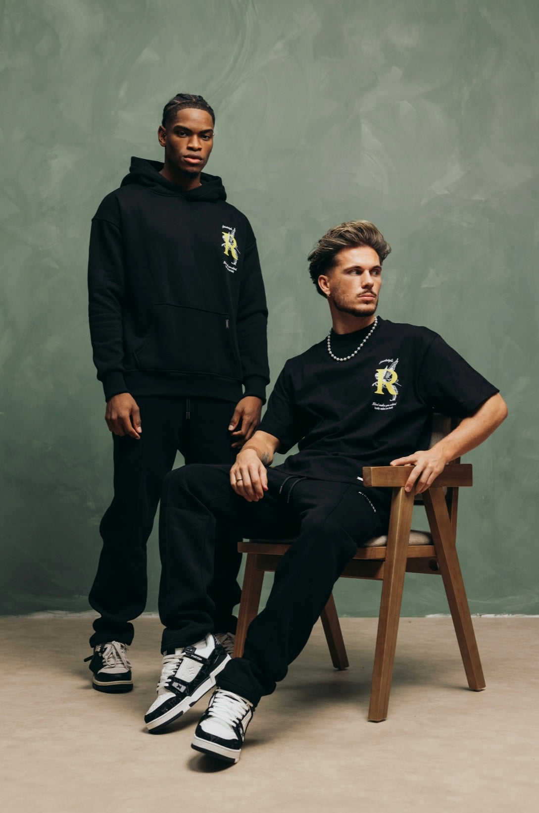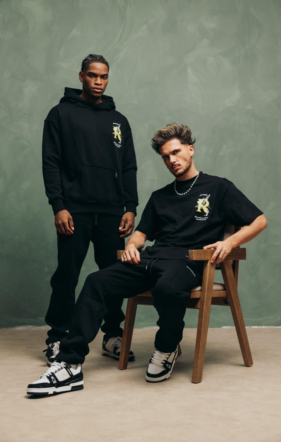 Our Artemis hoodie is made of sturdy Organic Cotton. The hoodie has a spacious hood. Our returning Richesse logo appears on the front. On the back you will find the characteristic text "Blood Makes You Related, Loyalty Makes you family". The pants are slightly oversized with a flair at the bottom. There is a hidden zipper in the trouser leg so you can add flair.