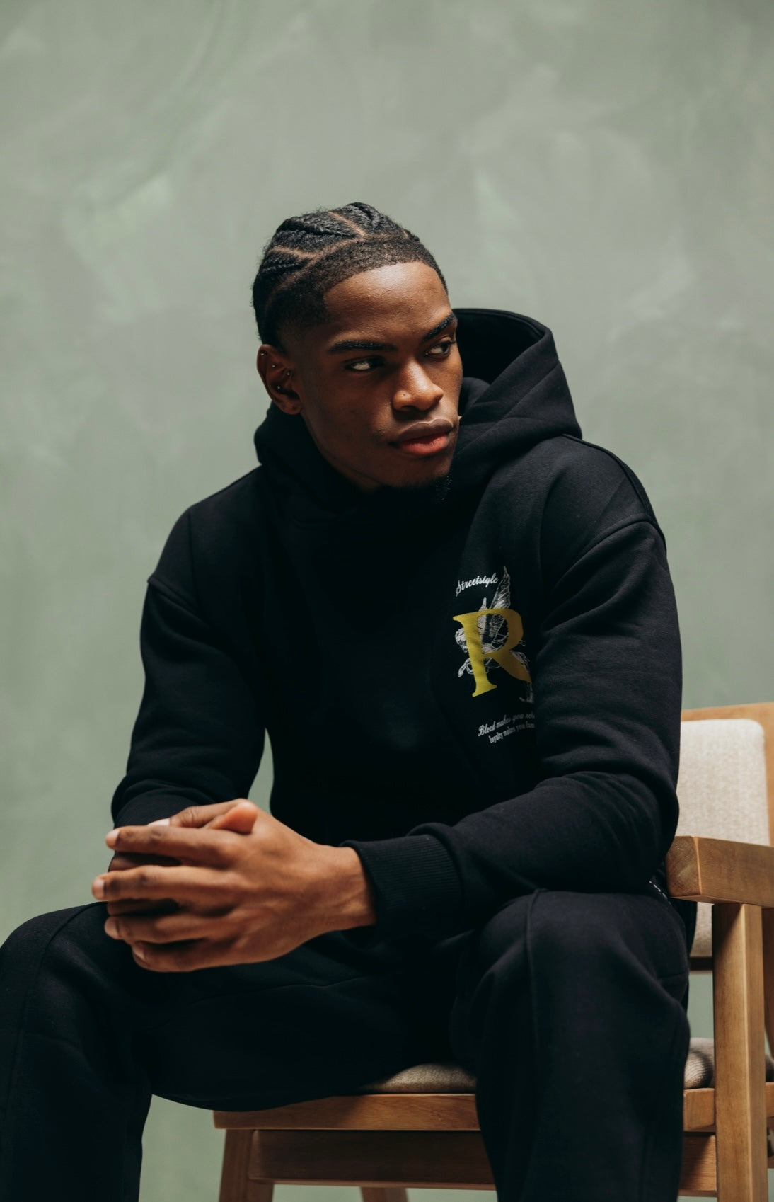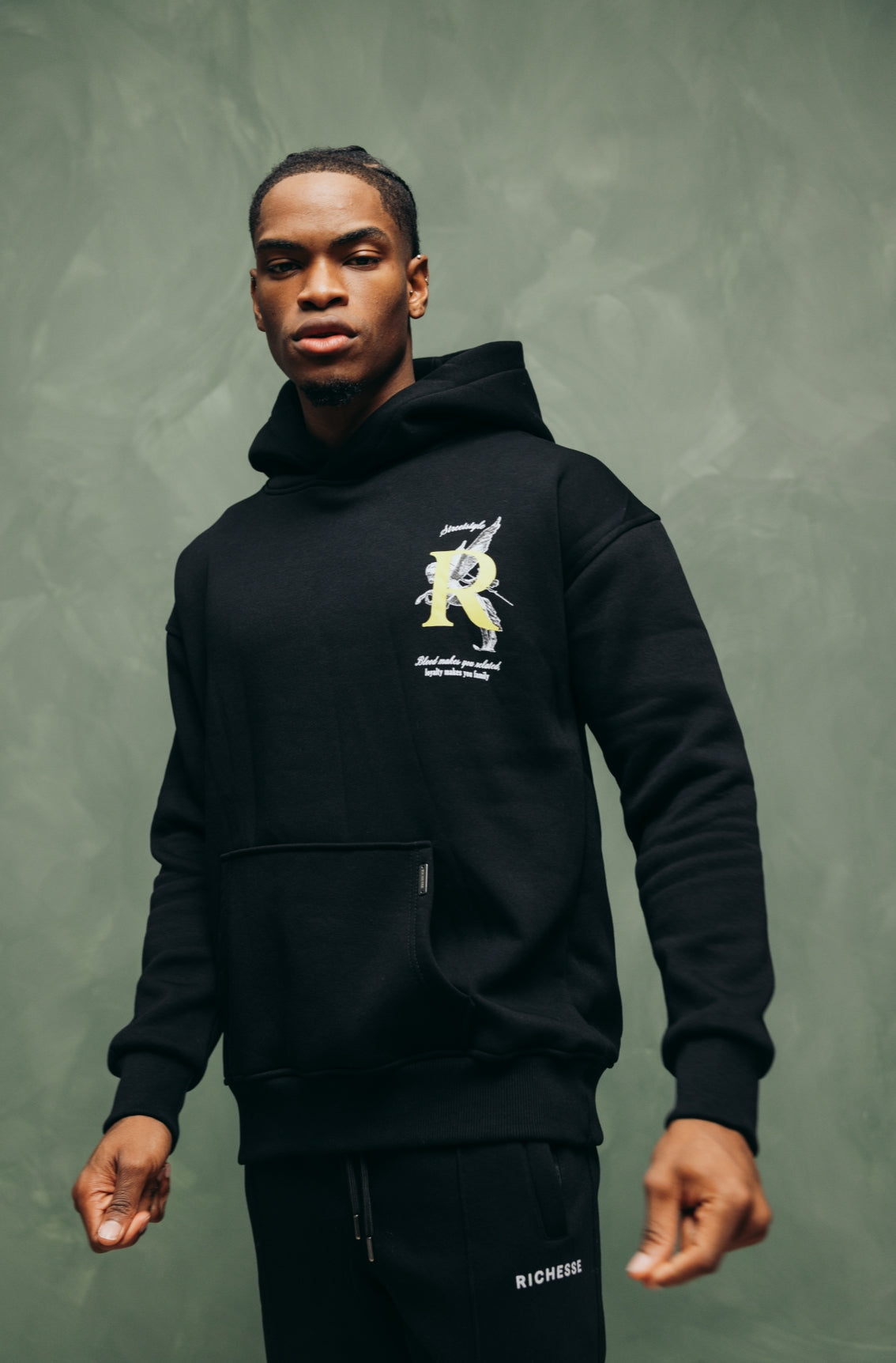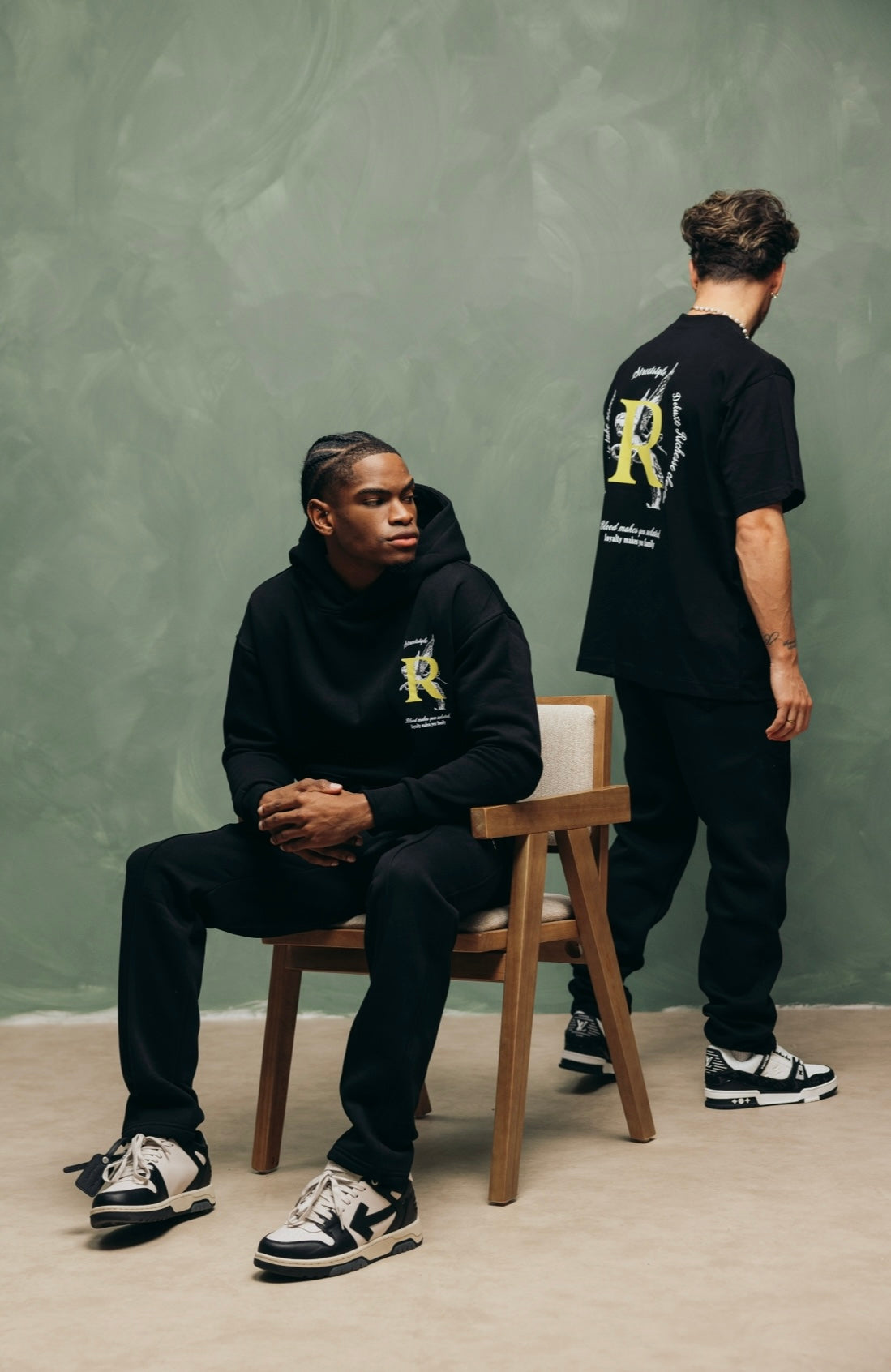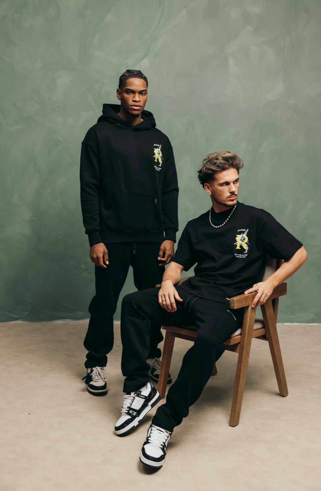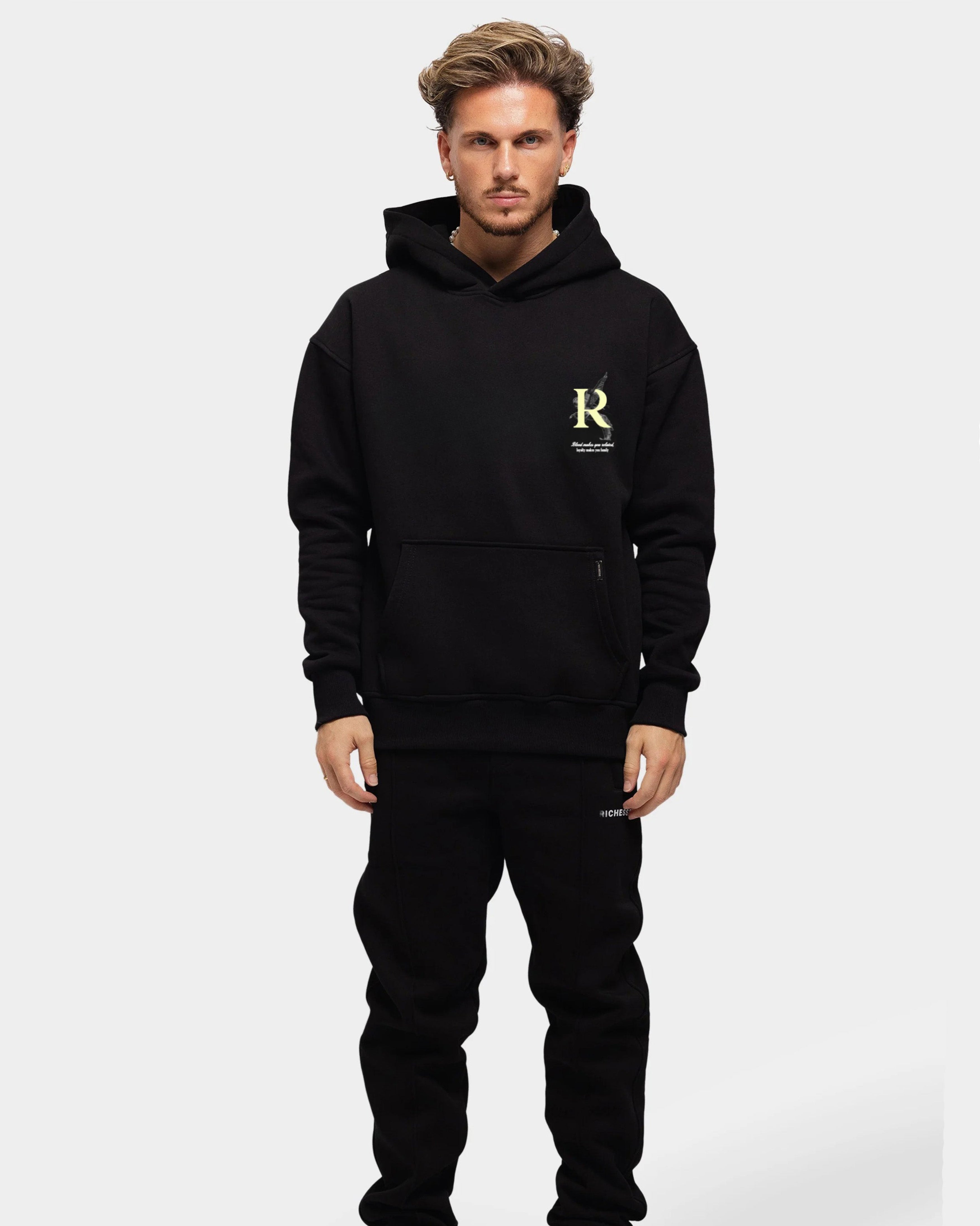 Our Artemis hoodie is made of sturdy Organic Cotton. The hoodie has a spacious hood. Our returning Richesse logo appears on the front. On the back you will find the characteristic text "Blood Makes You Related, Loyalty Makes you family". The pants are slightly oversized with a flair at the bottom. There is a hidden zipper in the trouser leg so you can add flair.