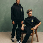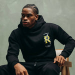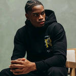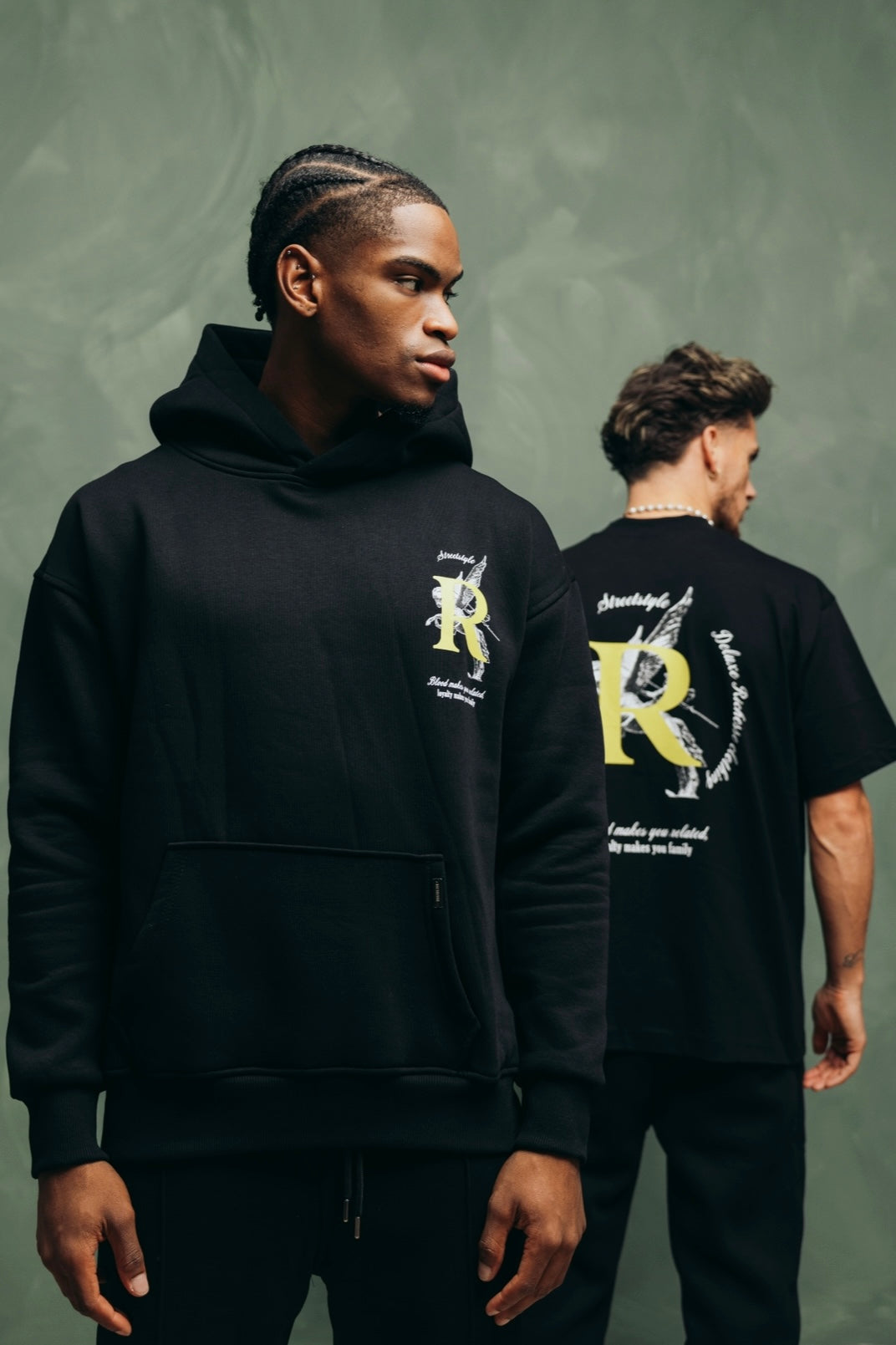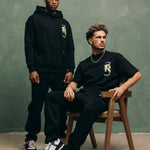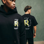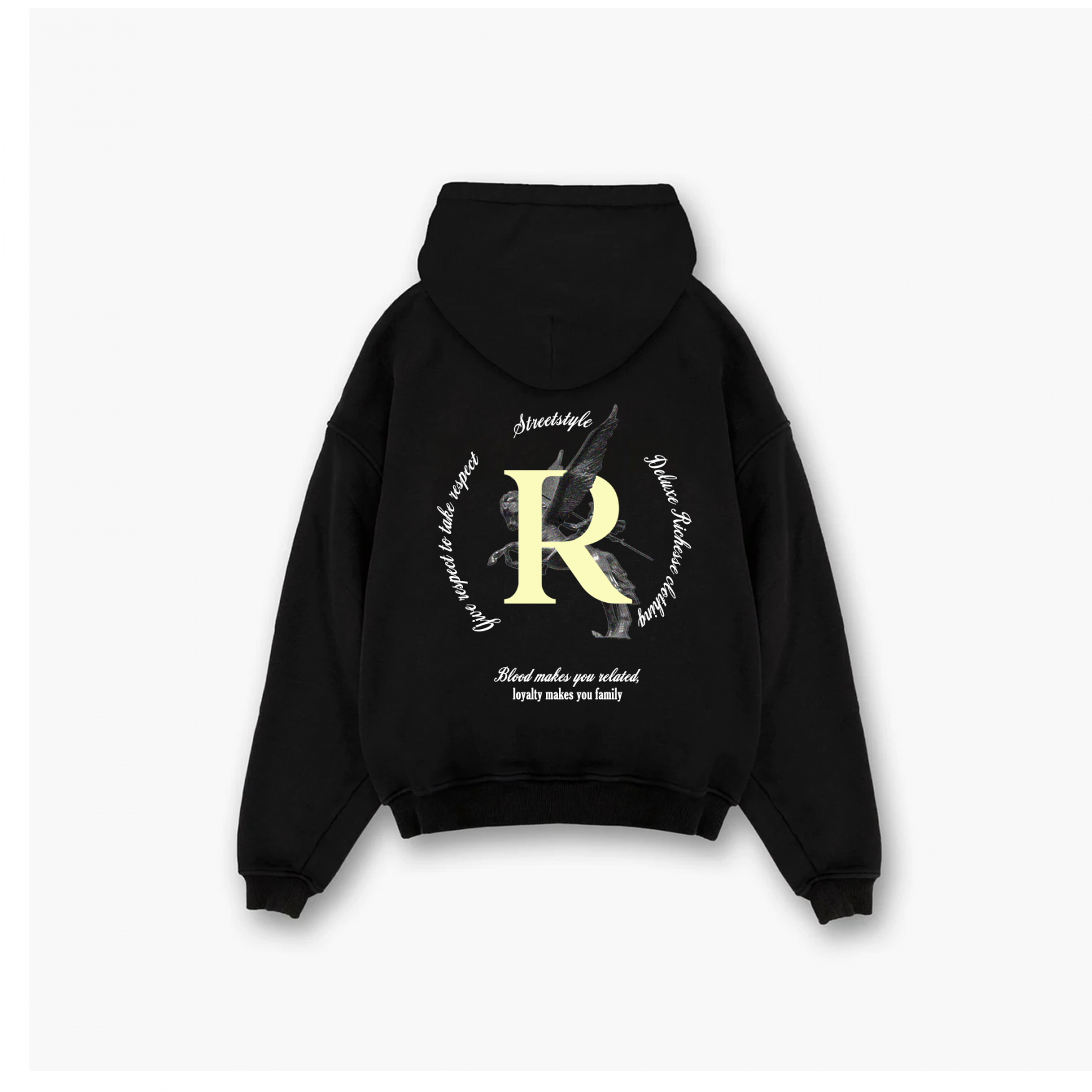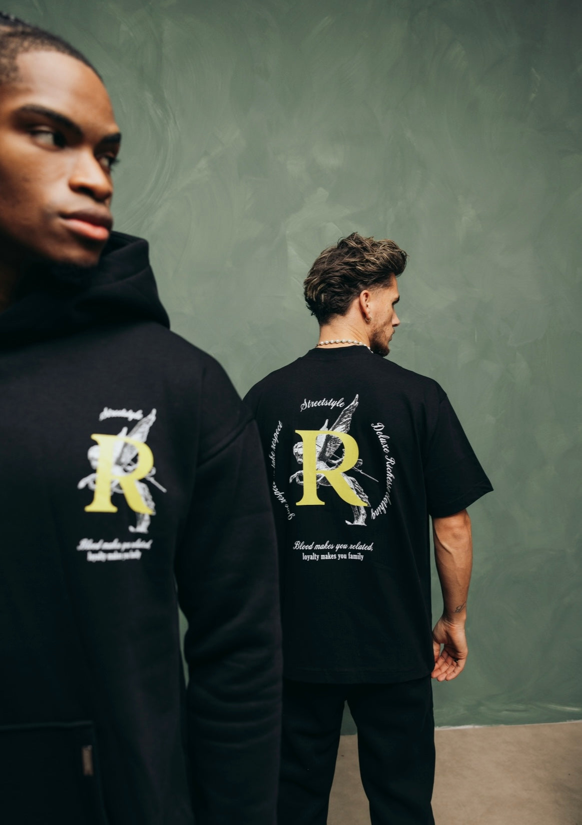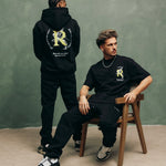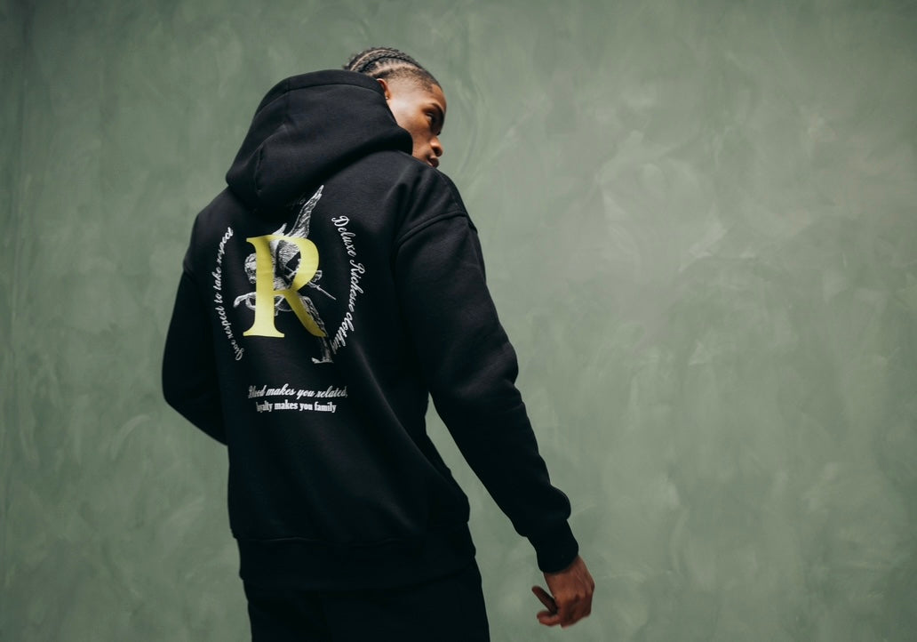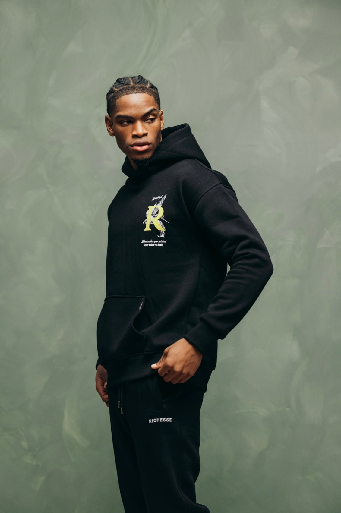 Our Artemis hoodie is made of sturdy Organic Cotton. The hoodie has a spacious hood. Our returning Richesse logo appears on the front. On the back you will find the characteristic text "Blood Makes You Related, Loyalty Makes you family". The pants are slightly oversized with a flair at the bottom. There is a hidden zipper in the trouser leg so you can add flair.