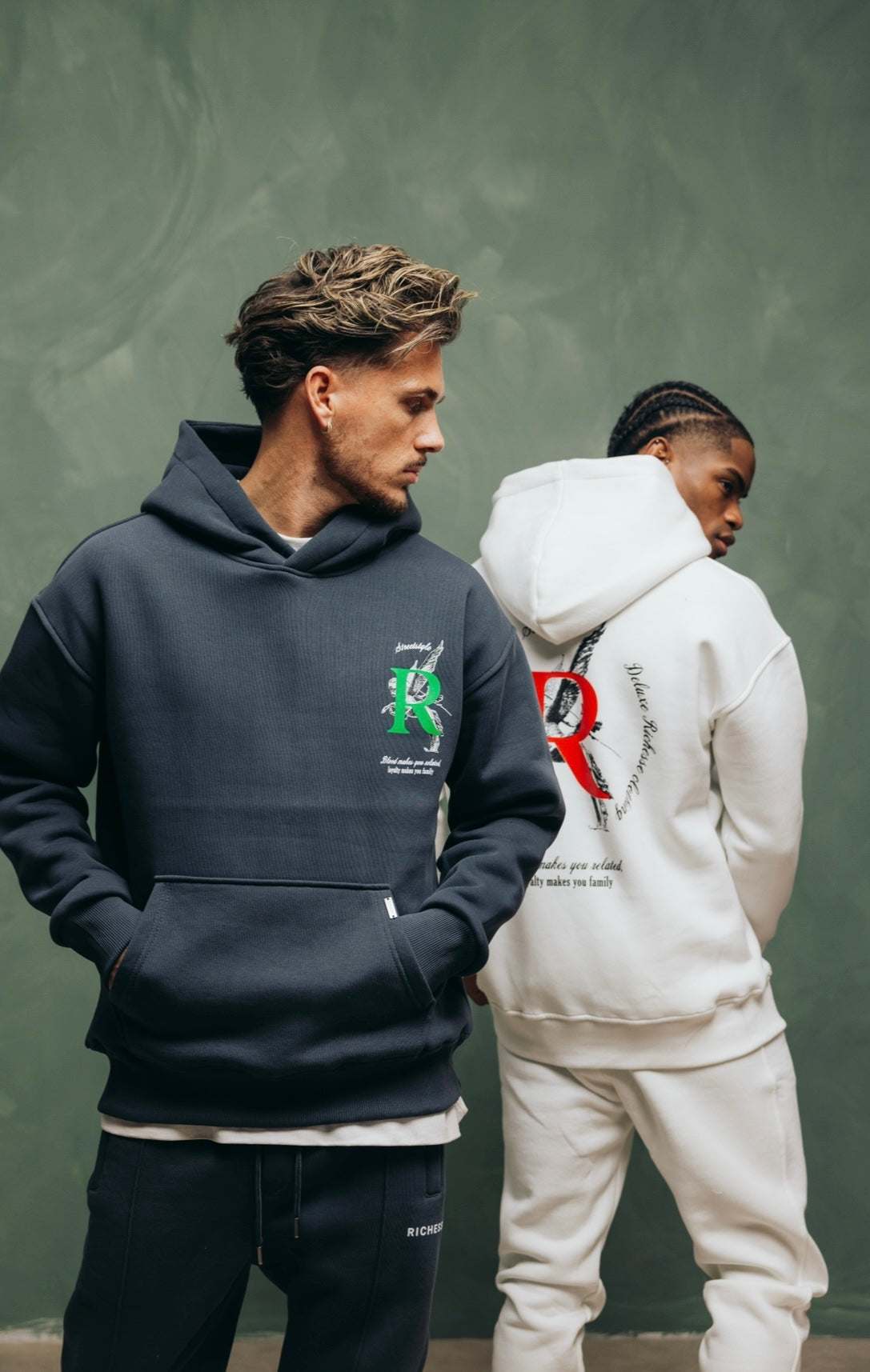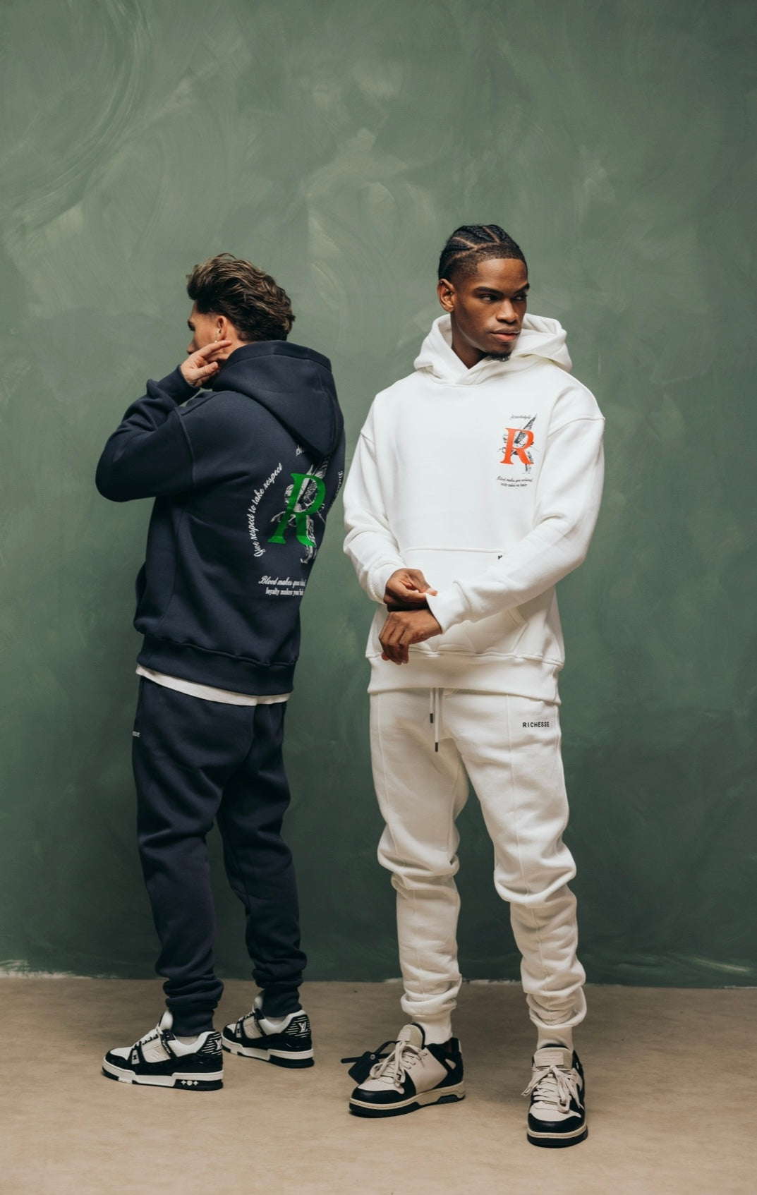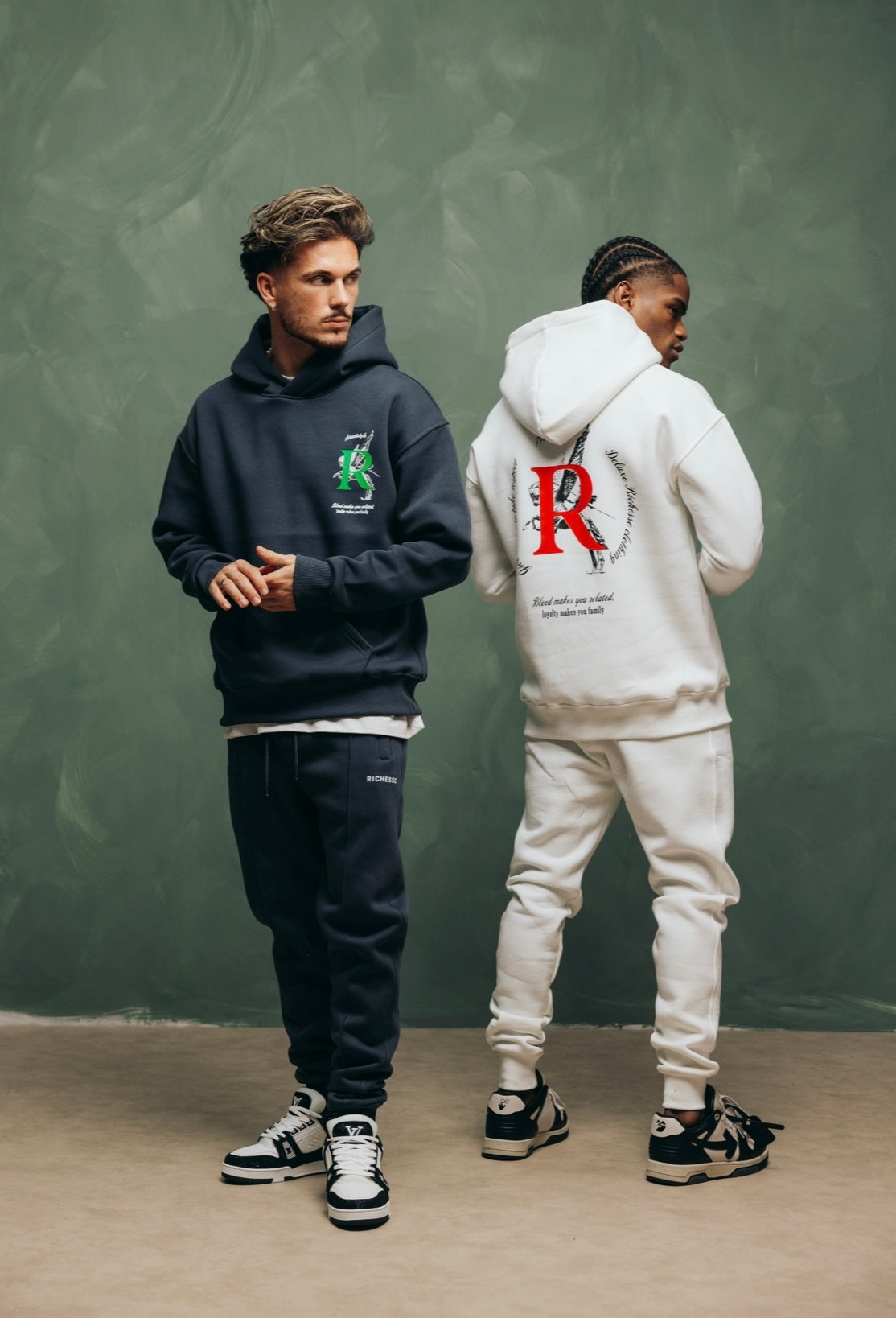 Our Artemis hoodie is made of sturdy Organic Cotton. The hoodie has a spacious hood. Our returning Richesse logo appears on the front. On the back you will find the characteristic text "Blood Makes You Related, Loyalty Makes you family". The pants are slightly oversized with a flair at the bottom. There is a hidden zipper in the trouser leg so you can add flair.