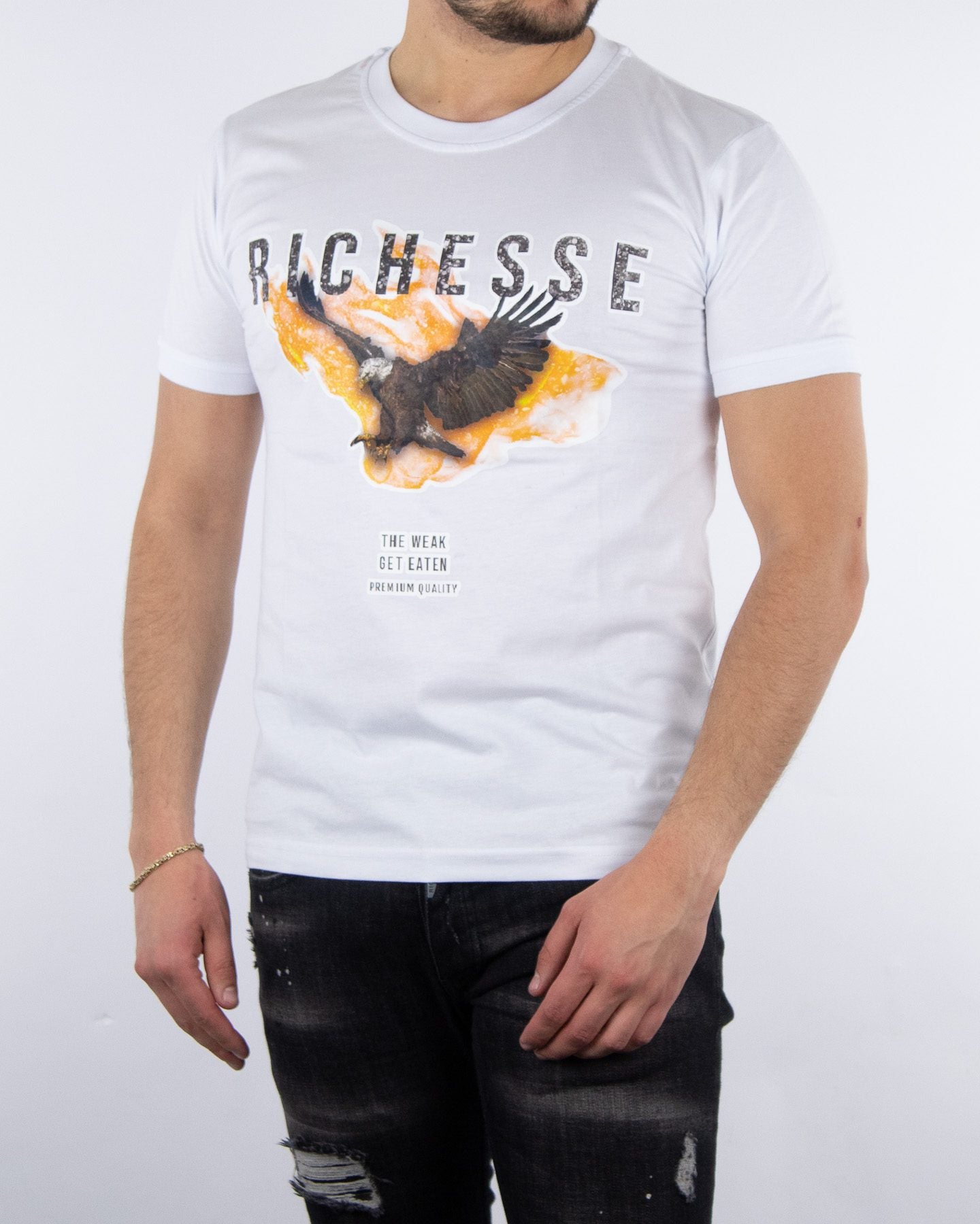 Een mooi basis T-shirt uit de nieuwe collectie van Richesse. Het T-shirt is wit van kleur en is een strak model. Het T-shirt van Richesse is gemakkelijk te combineren met een skinny jeans van Richesse.